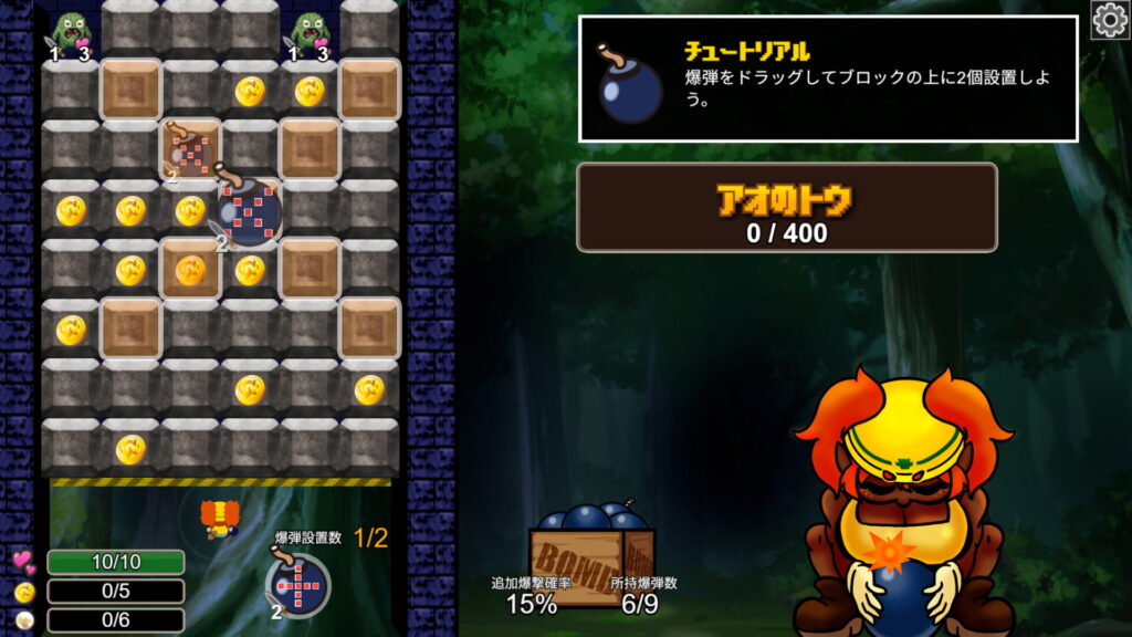 『ダンジョンボンバー』は、爆弾を設置して誘爆させ、ダンジョンを豪快に破壊していく“爆破連鎖ローグライト”ゲームです。ルールはシンプル。毎ターン手札から爆弾を設置し、爆発させるだけ。コインブロックを爆破してお金を稼ぎ、敵を倒しながらダンジョンを掘り進めよう。