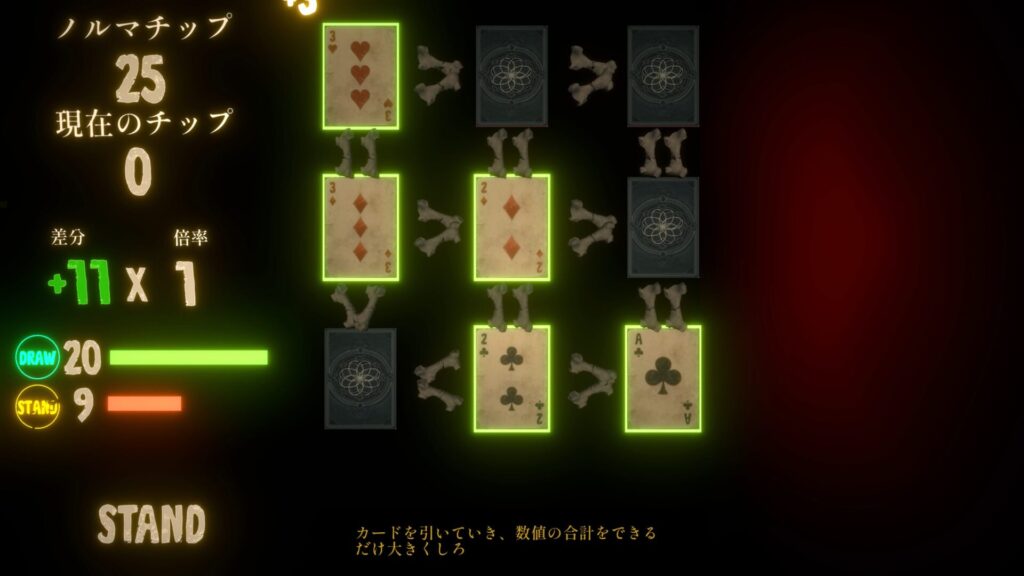 アイテムを使うことでさらに得点を伸ばすことができます。アメミトから要求されるチップ数は回を増すごとに増えていくため、アイテムをうまく組み合わせることが鍵となるでしょう。21を目指すだけでなく、アイテムとのシナジーを考えながらカードを引いていく必要があります。
