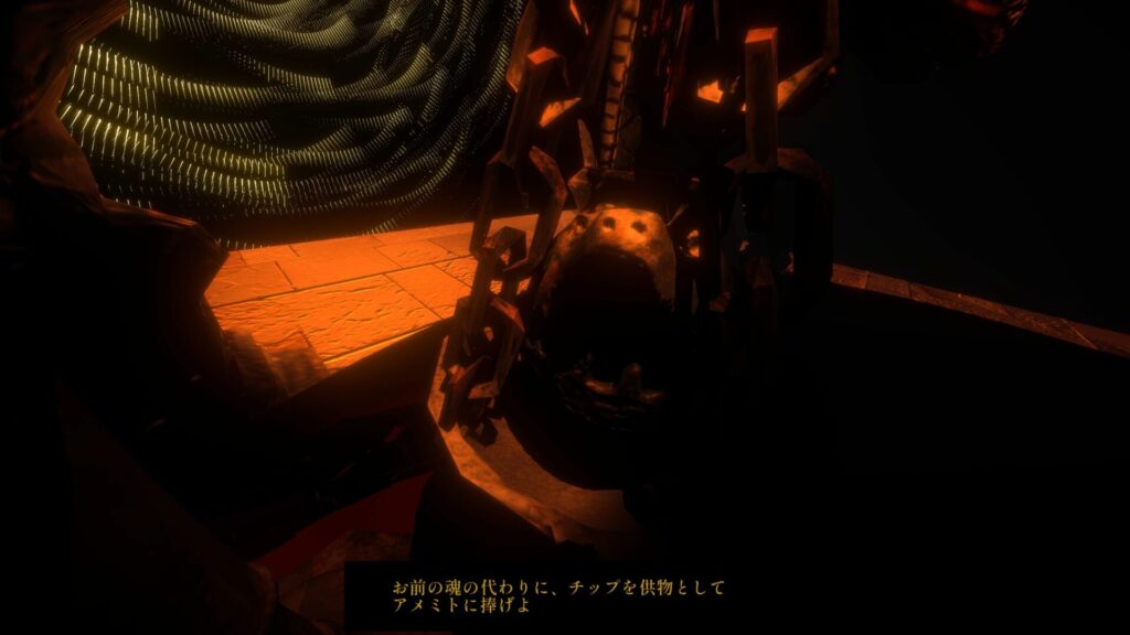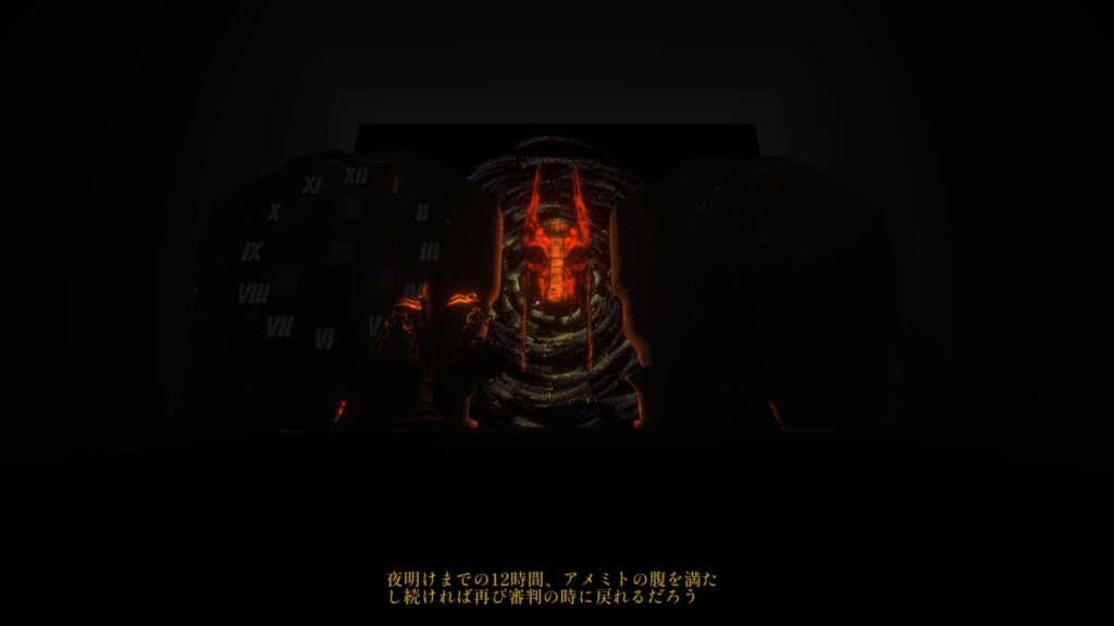 プレイヤーは冥界の賭博場にて勝負を始めようとしています。アメミトに魂を喰われて復活は絶望的かと思われましたが、夜が明けるまでの12時間、チップを供物として捧げ続ければ復活のチャンスが与えられるとのこと。最後のチャンスを掴み取り、無事転生することができるのでしょうか。